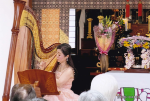 ⑥お教室のパイプオルガン、グランドハープを体験できる。